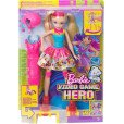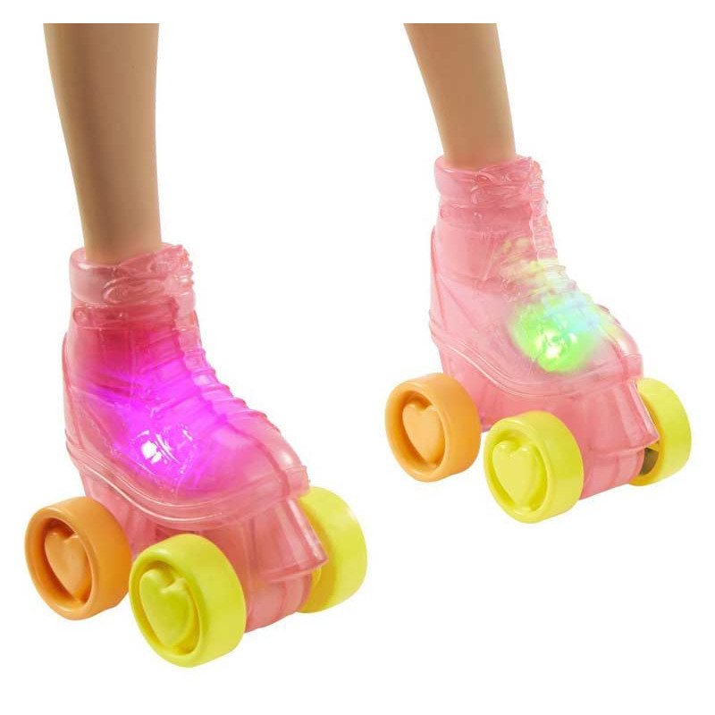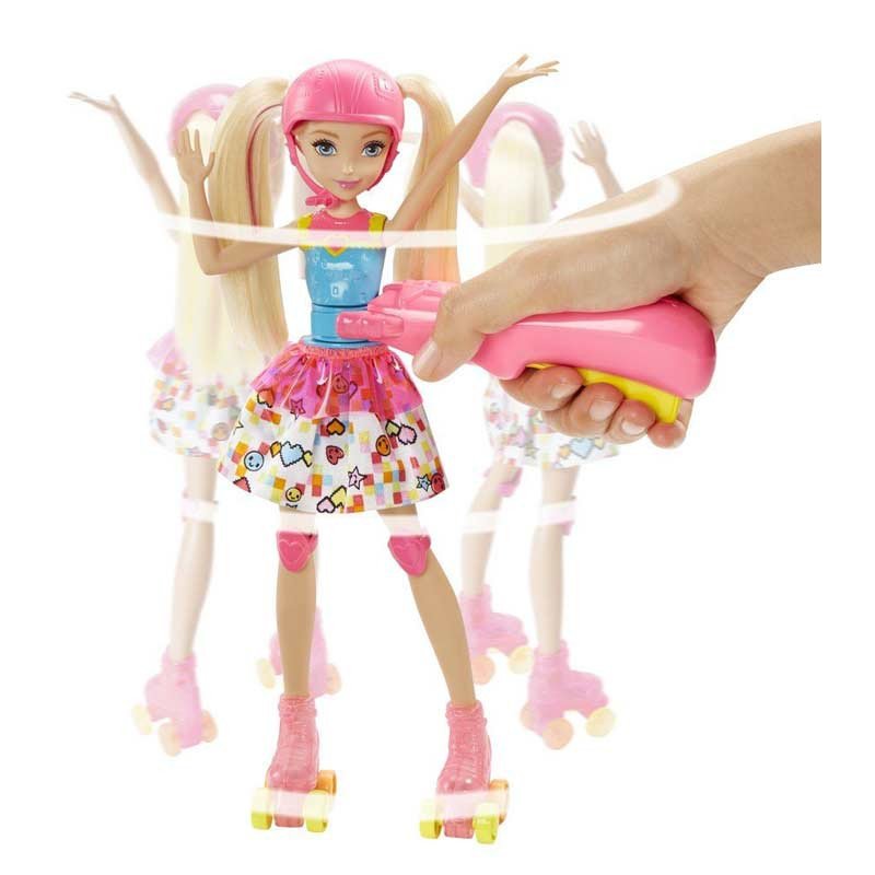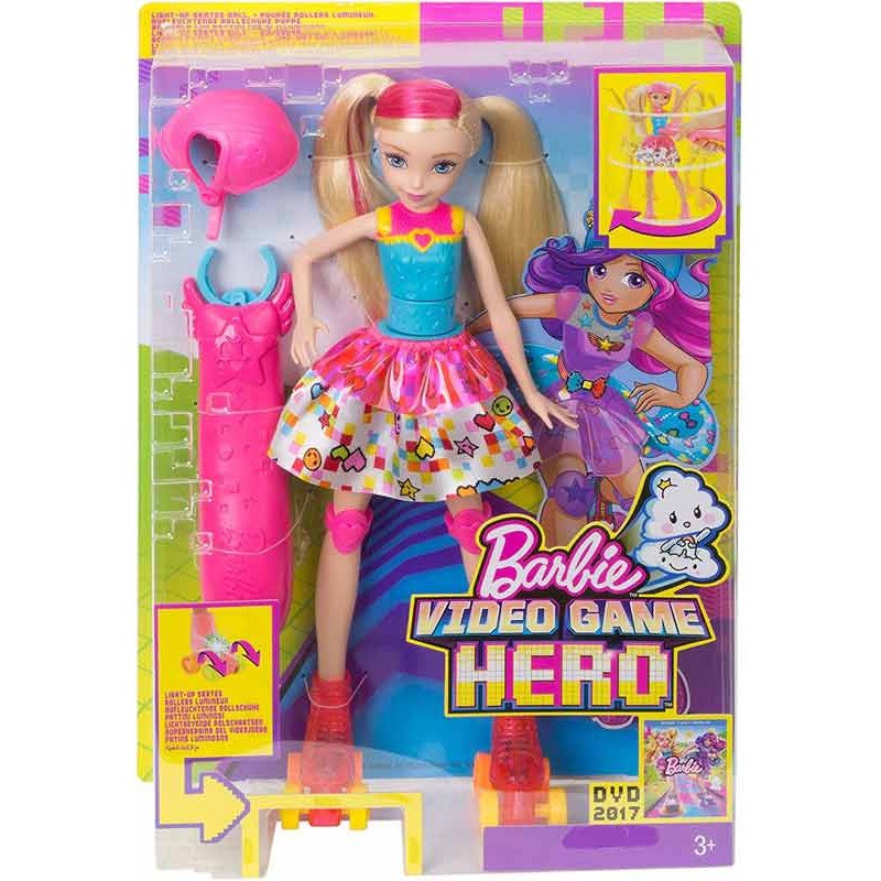 Muñeca Barbie Superheroína del videojuego con patines que tienen luz ¡Conviértete en una profesional en los videojuegos con Barbie! Esta Barbie está inspirada en la nueva película Barbie Superheroína del videojuego. Tiene un increible look de patinadora y unos patines que funcionan de verdad y lo mejor de todo, ¡se iluminan al mover la muñeca!. Incluye un clip a juego alrededor de su cintura para controlar mejor sus movimientos. Barbie Superheroina del Videojuego puede avanzar o retroceder, también al pulsar el botón amarillo hace giros de 360 grados. Mientras se mueve, ¡sus patines se iluminan con cuatro colores diferentes. Esta Superheroina luce un corpiño radiante de colores con un estampado de corazones, una falda blanca con un estampado de iconos y una sobrefalda rosa de plástico. Las rodilleras son de color rosa y tiene un casco extraíble a juego. La muñeca no puede tenerse en pie ni patinar por sí sola. Mattel. Edad Recomendada +3