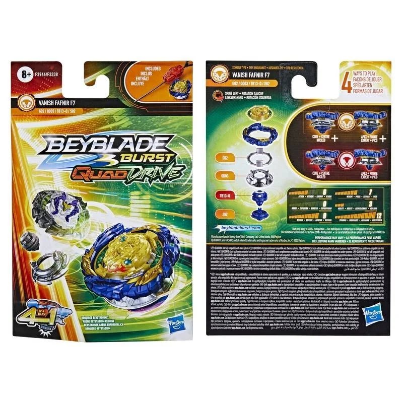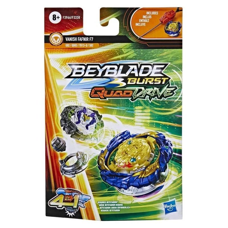 Peonza Beyblade Quad Drive Vanish Fafnir F7. Compite en estadios Beyblade con esta peonza con rotación a la izquierda. Vanish Fafnir F7 destaca por su ratio de defensa (9) y asistencia (12). ¡Es una máquina defensiva! Hasbro. Ref.: F3338A. Edad recomendada: +8 años.