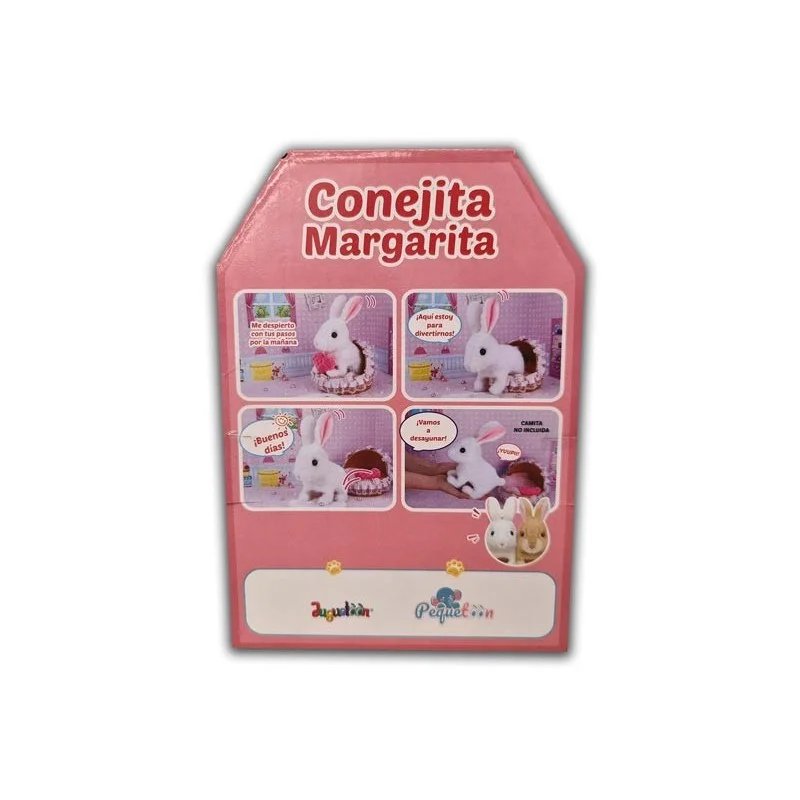 La conejita Margarita es un suave peluche de nuestra marca exclusiva Pequetoon. Margarita es una conejita de color blanco y pelo muy suave. Hace sonidos y se mueve como un conejito de verdad. Será el compañeros favorito de tu peque. Pequetoon. Ref.: A502527. Edad recomendada: +18 meses.