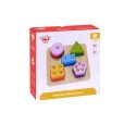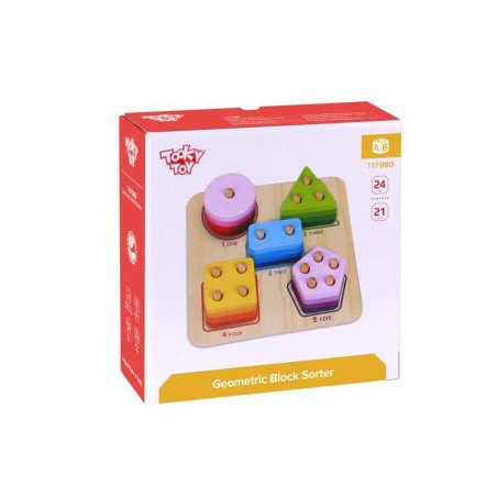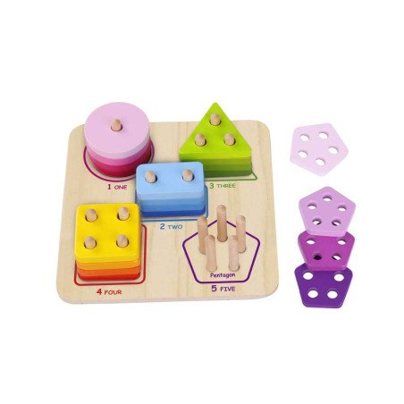 Este juego de bloques geométricos está fabricado en madera. Existen 5 figuras diferentes, las cuales encajan en un soporte determinado. Gracias al mecanismo del juego, podrán aprender los números en inglés, los colores y las figuras geométricas. Juguetoon. Ref.: TKF080. Edad recomendada: +2 años.