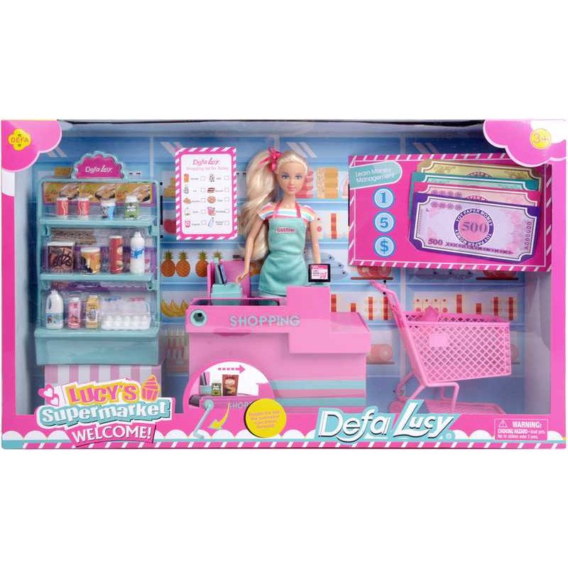 Abre tu propio Supermercado y vende todo tipo de comida con la Muñeca Lucy. Con este juego, ¡aprenderás a manejar y administrarte el dinero! Lucy luce un precioso conjunto de dependienta de caja. El set viene con un mostrador con máquina TPV, una estantería con varios productos en venta, billetes y monedas de juguete y un cartel que refleja los productos que están en venta. Juguetoon. Ref.: 22-012. Edad recomendada: +3 años.