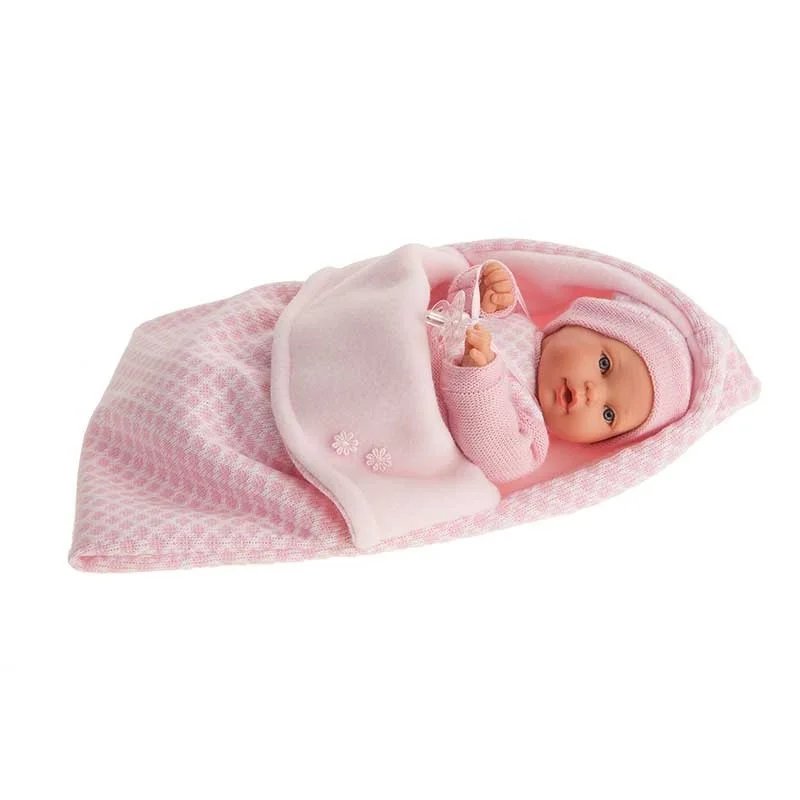 Kika es una Muñeca çantonio Juan con el cuerpo de tela, mide unos 27 cm aproximadamente, viene tumbadita en su saquito rosa. Kika es no sexada, no articulable y no tiene pelo. Tiene unos ojos azules preciosos, siempre abiertos, y con su chupete en la boca. Pero ten cuidado, cuando le quitas el chupete, llora y dice papá y mamá. Muñecas Antonio Juan. Ref.: 1112. Edad orientativa: +3 años.