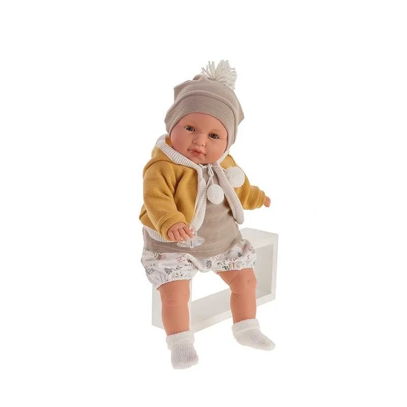 Lolo Coordinado Ocre es una muñeca de Antonio Juan de 55cm. Lolo es un simpático bebé con un conjunto de ropa ideal. Tiene el cuerpo de trapo, no está sexado, tiene ojos móviles e incluye chupete. ¡Cuidado con el chupete! Cómo se lo quites, se pondrá a llorar. Muñecas Antonio Juan. Ref.: 1901. Edad orientativa: +3 años.