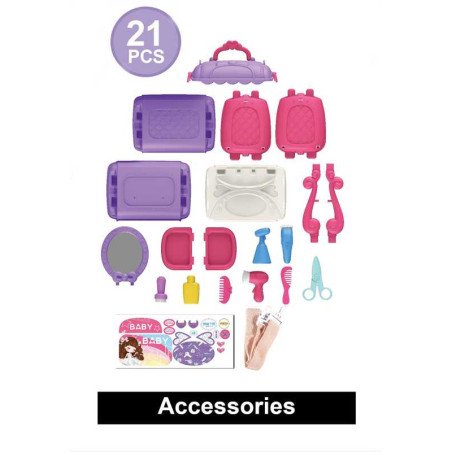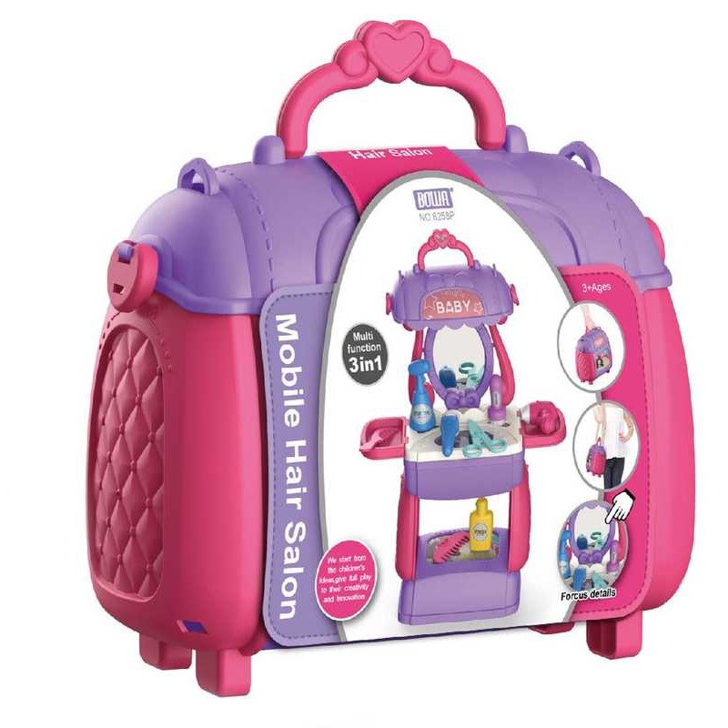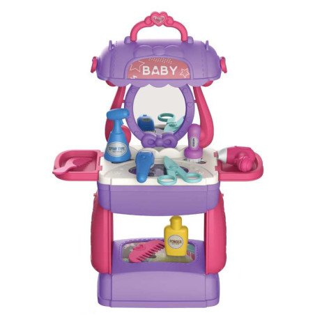 ¡Pela a todos tus clientes donde quieras con esta peluquería Móvil 3 en 1! También lo podrás transportar modo bolso gracias a sus tiras. Juega con creatividad y con innovación. ¡Este set viene con 21 piezas! Medidas: 34,2 x 14 x 48 cm. Juguetoon. Ref.: 21-079. Edad recomendada: +3 años.